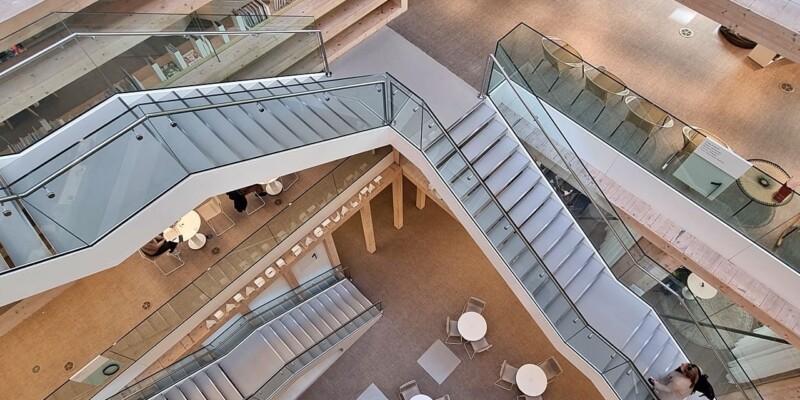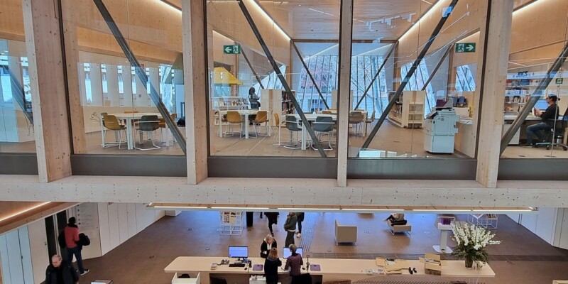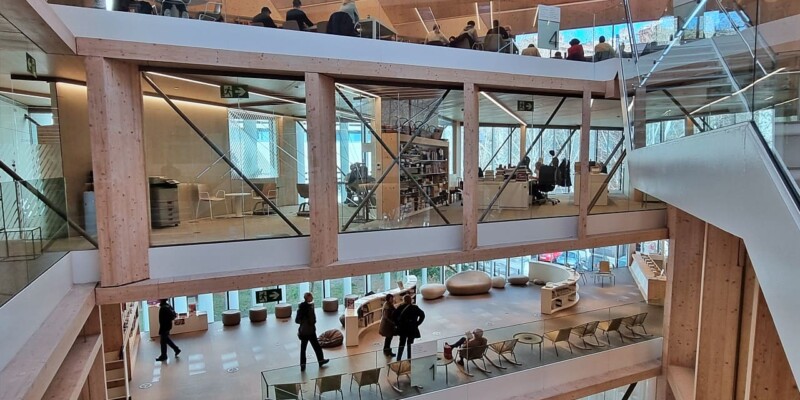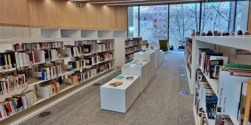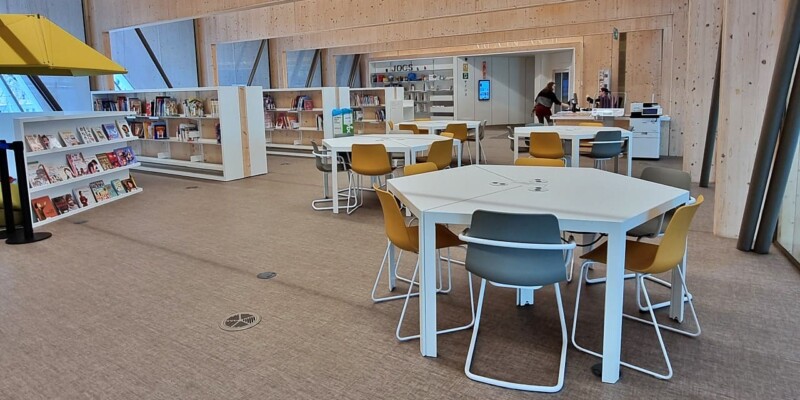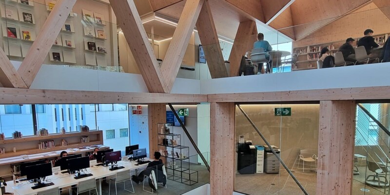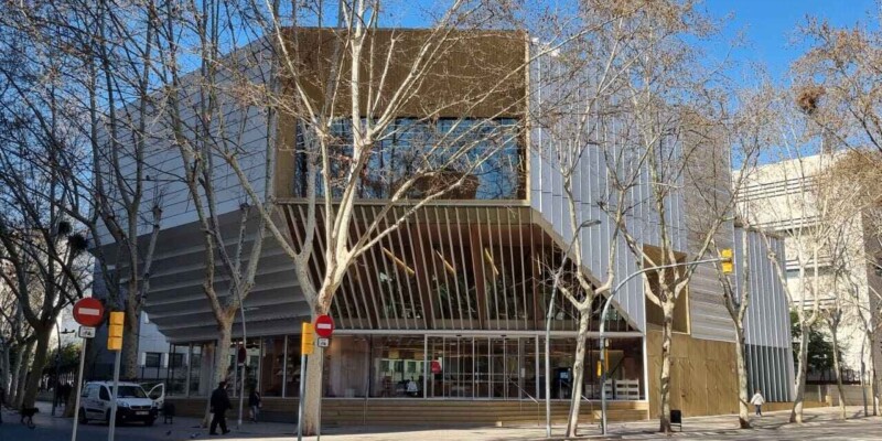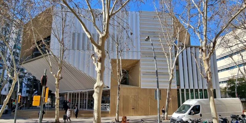 Esta biblioteca, un imponente edificio de seis plantas, es la tercera mayor de la ciudad, con sus 3.300 m2. Ha sido proyectada por los arquitectos: Elena Orte y Guillermo Sevillano, del estudio Suma Arquitectura. A mí, personalmente, me sorprendió por la amplitud de sus espacios y su luminosidad, por los diferentes ambientes, confortables y adaptados a diferentes usos y la selección de materiales y de mobiliario, además de contar con su propia emisora: Ràdio Maconda.